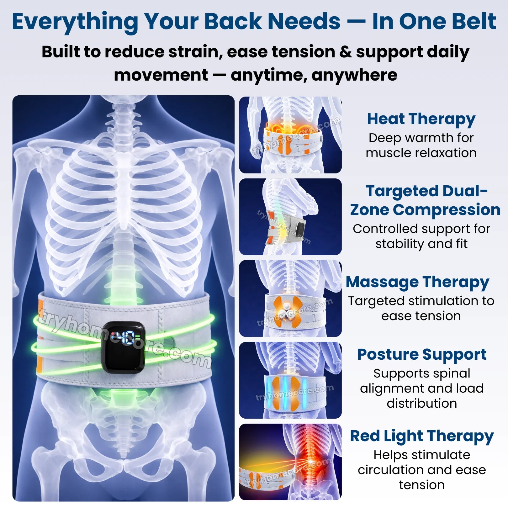 The CoreRelief 5-in-1 At-Home Back Therapy Belt delivers massage therapy, deep heat therapy, dual-zone compression, red light therapy and posture support — the same treatments used in professional therapy sessions, now available anytime, from home.